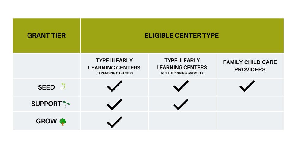 Grants will be awarded between $5,000 and $250,000 per application in line with the Seed, Support, and Grow levels listed in the chart below.