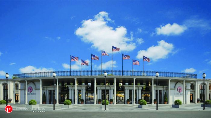 Plans for the indoor water park include a family wave pool, action river, interactive play areas, and a slide complex. The development also features an eight-acre family beach with waterfront dining and retail, a clubhouse, amphitheater, and event spaces such as a wedding peninsula and cocktail lawn. Additional elements of the early plans include an entertainment center, green-space courtyards, a central courtyard with an overpass walkway, and 100,000 square feet of dining and retail spanning food and beverage, apparel, sporting goods, and general merchandise.