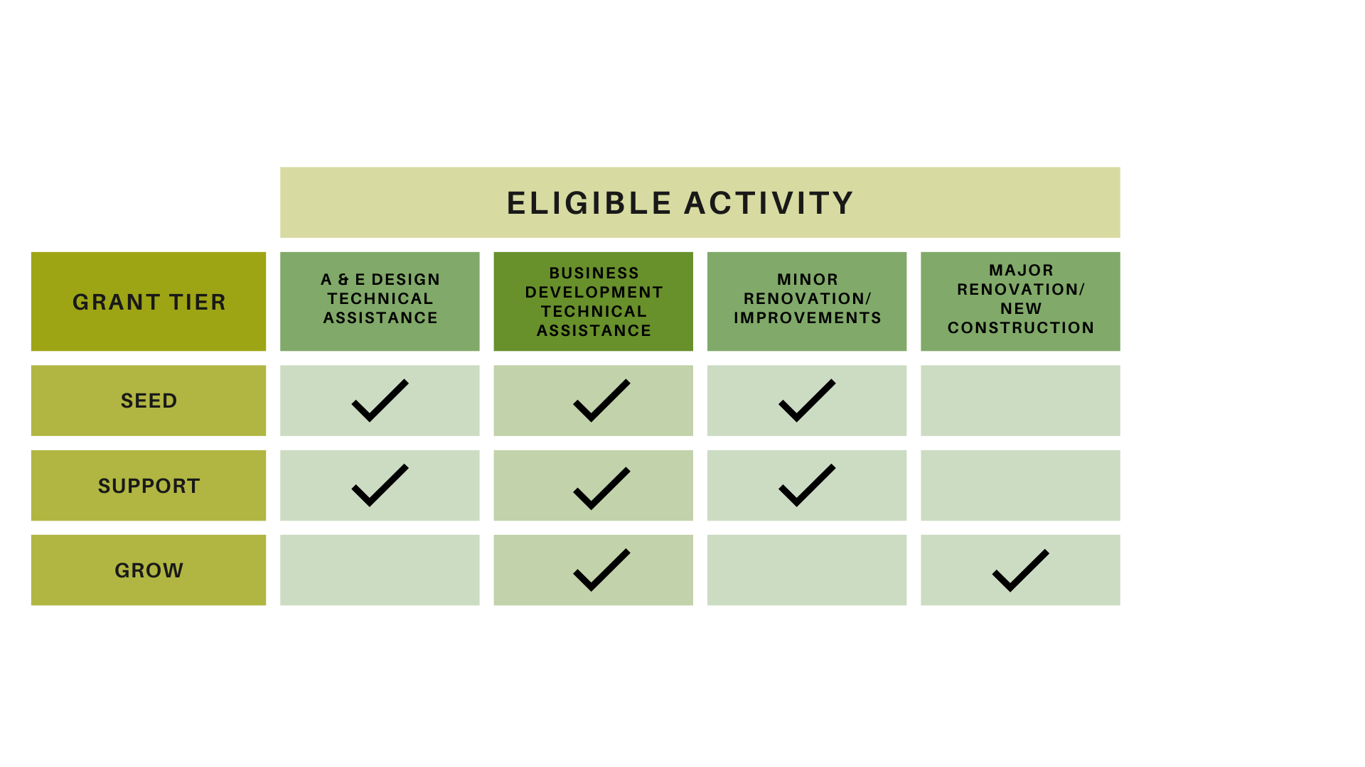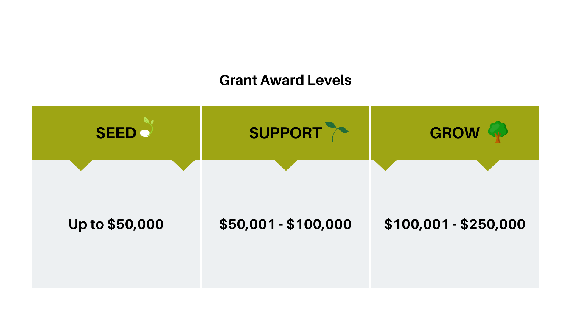 Grants will be awarded between $5,000 and $250,000 per application in line with the Seed, Support, and Grow levels listed in the chart below.