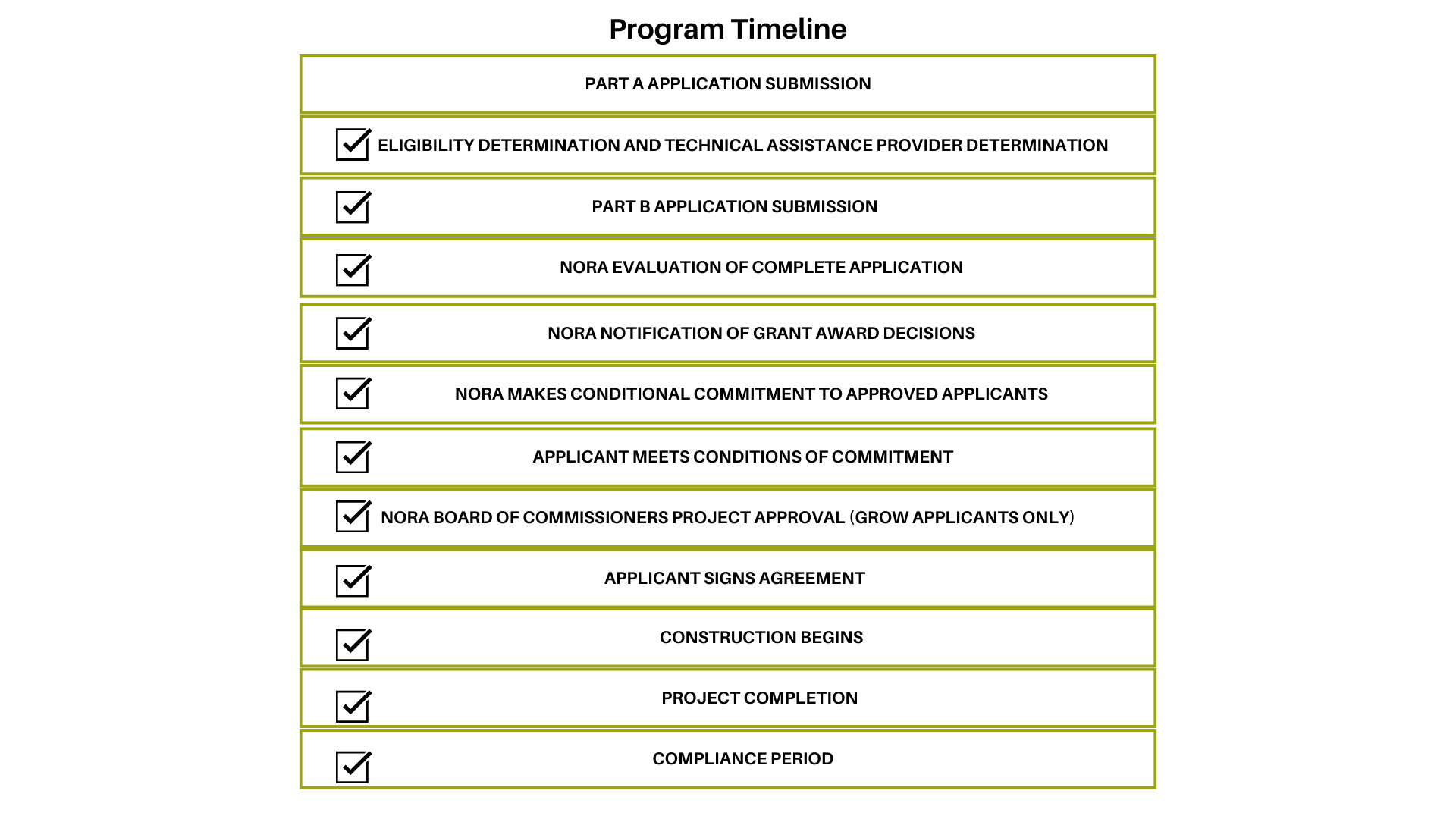 Part A applications will be closed until further notice. After the Initial Application Period ends, Part B Applications will be accepted on a rolling basis, with rolling deadlines. Rolling deadlines for 2025 are intended to align with the bi-monthly cadence of NORA's Board of Commissioners Meeting.