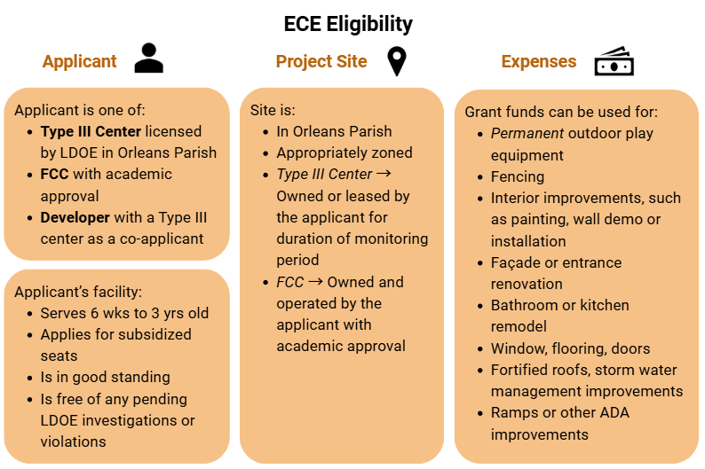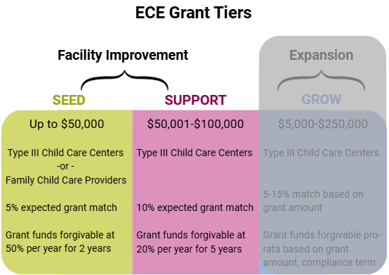 Grantees shall agree to operate, or continue to operate, an Early Childhood Education facility meeting program terms outlined in the grant agreement for a minimum of 2 years for Seed Grants and 5 years for Support Grants, from the completion of fund disbursement. Grant funds will be forgivable, and subject to recapture, on a prorated basis: